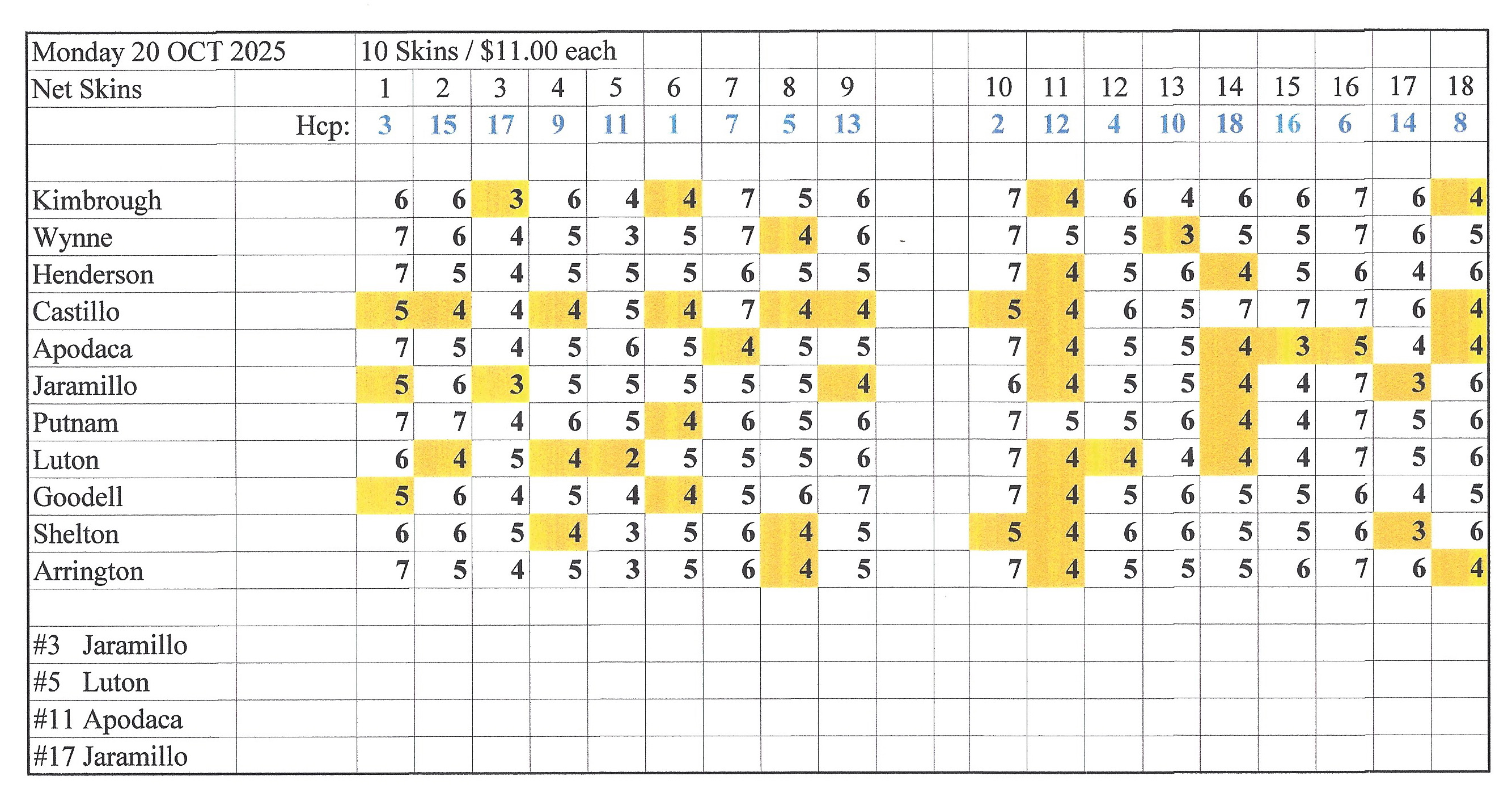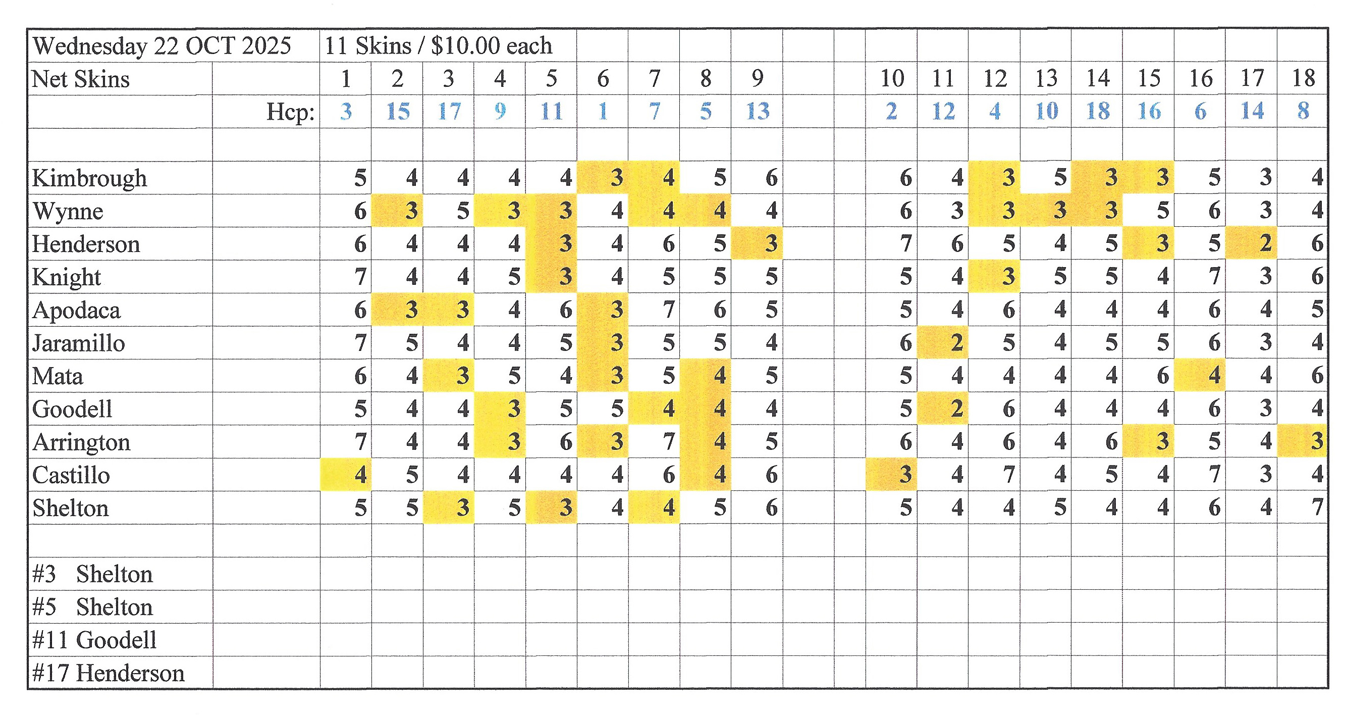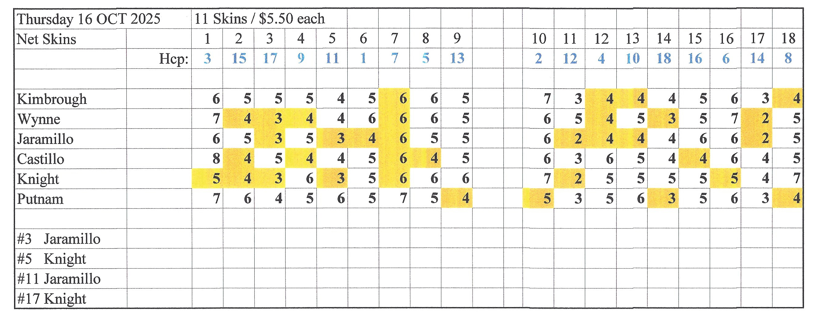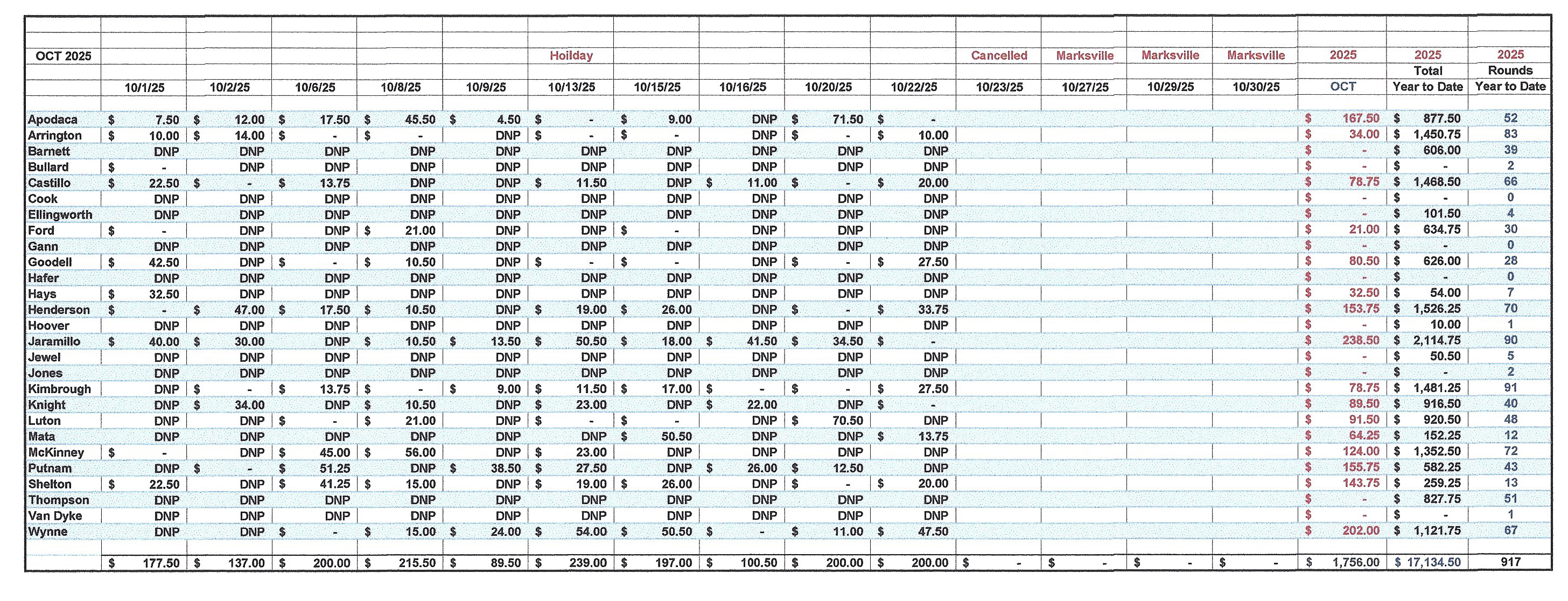 Semi-Annual Fall Tournament Scheduled for Wednesday 12 NOV 2025 Sign-Ups now being Taken PLAY THE BUNKERS 23 OCT 2025 -- Thursday -- Cancelled -- Not Enough Players 27-30 OCT 2025 -- No Games Scheduled -- No Tee Times Made JLK and a number of other players away at the Marksville, La., Tournament Daylight Savings time ends Monday 3 NOV 2025 Tee Times and Show Times will not change 3 NOV 2025 -- Monday -- Three Tee times 0750 -- Show Time 0715 5 NOV 2025 -- Wednesday -- Three Tee times 0750 -- Show Time 0715 6 NOV 2025 -- Thursday -- Two Tee times 0750 -- Show Time 0715 Advance Sign-Up Required for Thursday Thursday play requires a minimum of six players. Text JLK (817) 832-3443 or E-Mail JLKCSA@aol.com If six players have not committed, there will not be a game. DO NOT BE LATE 23